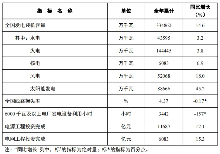 2024年,全國6000千瓦及以上電廠發(fā)電設(shè)備累計平均利用3442小時,比上年同期減少157小時;全國主要發(fā)電企業(yè)電源工程完成投資11687億元,同比增長12.1%;電網(wǎng)工程完成投資6083億元,同比增長15.3%。