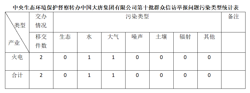 2025年6月13日,中央第七生態(tài)環(huán)境保護(hù)督察組向中國大唐集團(tuán)有限公司移交第十批群眾信訪舉報(bào)件,共計(jì)2件,均為來電舉報(bào),涉及水問題1個(gè)、大氣問題1個(gè)。所有舉報(bào)件辦理工作已第一時(shí)間進(jìn)入調(diào)查核實(shí)辦理程序,辦理情況將按照相關(guān)要求反饋督察組,并及時(shí)向社會(huì)公開。