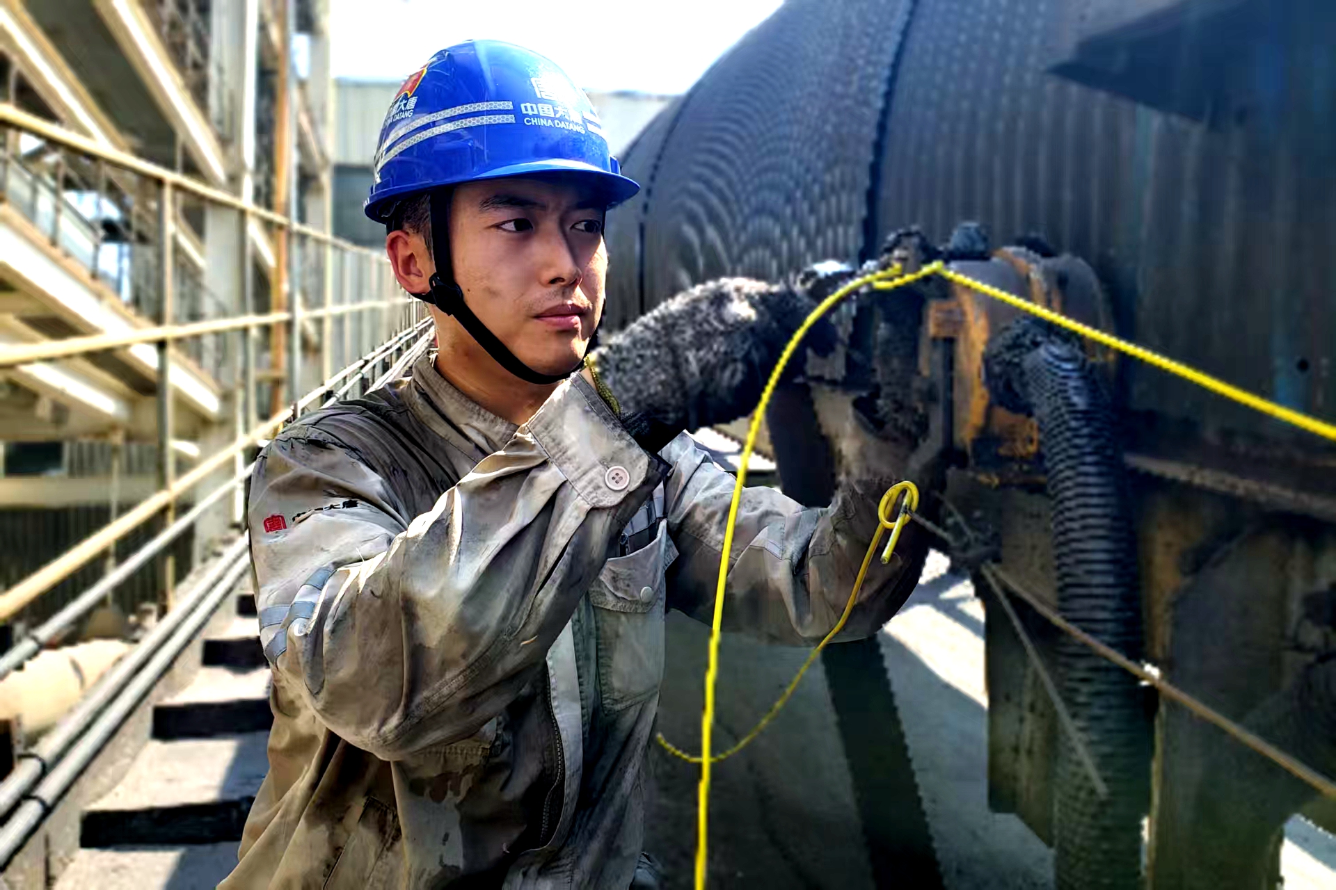 他們熟練地安裝上新的拉繩開關(guān),反復(fù)核對(duì)接線圖后將信號(hào)線牢固地接到端子上。“遞下新拉繩?!彪S著一聲呼喊,未紀(jì)牢迅速將新拉繩遞上去。他們默契配合,讓一卷拉繩舒展身軀沿著皮帶機(jī)架穿過一個(gè)又一個(gè)固定環(huán),并且逐一固定到拉繩開關(guān)上,確保每個(gè)間距的卡扣牢固緊實(shí)、拉繩松緊度恰到好處。盡管滿臉煤灰、渾身濕透,他們依舊有條不紊地推進(jìn)著,每個(gè)人的眼中都透露出必勝的決心。當(dāng)最后一道卡扣鎖緊時(shí),整條拉繩如琴弦般筆直繃緊。