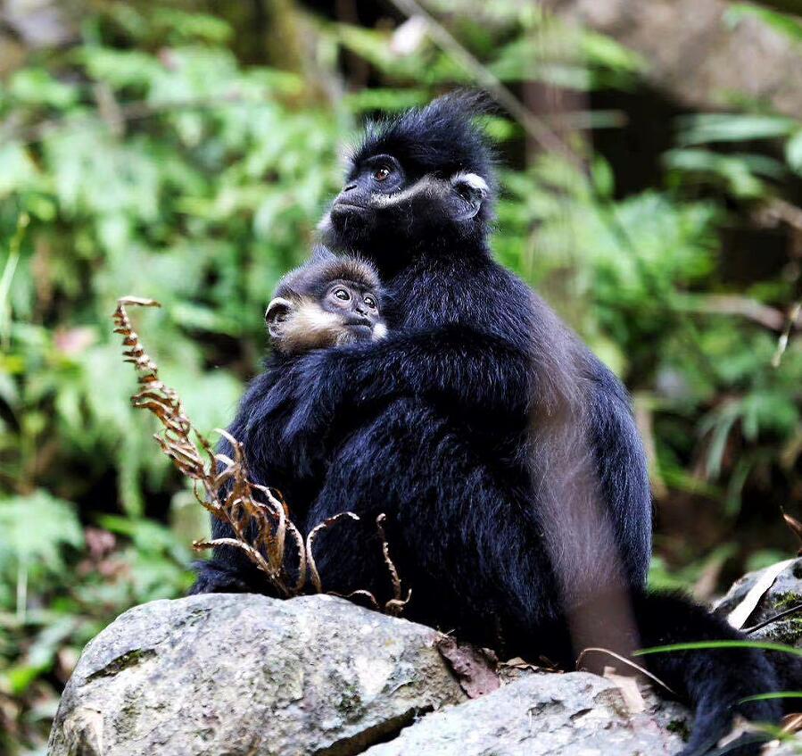 經(jīng)過長(zhǎng)途奔波,快艇行駛到貴州省沿河縣境內(nèi)的“麻陽河國(guó)家級(jí)自然保護(hù)區(qū)”。山上傳來各種表達(dá)不同“情緒”的叫聲,在生態(tài)環(huán)保專業(yè)崗位奮斗8年之久的饒振祺朝密林中一指:“快看,那就是黑葉猴!發(fā)出‘嘎,嘎’的叫聲,說明它們處在愉快的覓食狀態(tài)中;‘噢、噢’就是它們?cè)谏搅珠g攀援前進(jìn)的信號(hào)?!碧а弁?,巖石間、樹蔭深處不斷有黑葉猴迅捷地跳躍。它們頭頂冠毛蓬松,通體黑色,兩頰雪白的“絡(luò)腮胡”格外醒目,看起來像銀須飄飄的“小老頭”。有的黑葉猴懷里還抱著“金寶寶”——幼猴毛色金黃,隨年齡增大變黑。