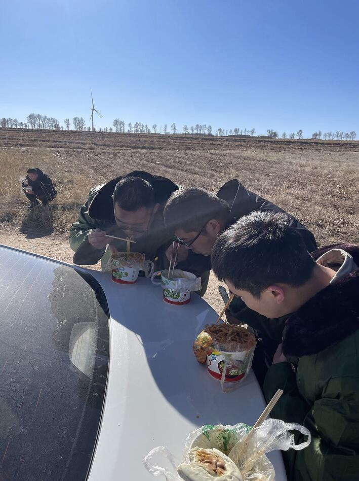 在風(fēng)場值班時(shí),一日三餐只能是泡面、自熱米飯這類速食品。為方便下班的同事吃飯、保證飲食安全,大家在住宿賓館附近選擇一家小餐館,作為值班回來就餐的“定點(diǎn)食堂”。接上完成交接班的同事們,我們一起去體驗(yàn)了“食堂”。晚餐過程中,大家說說笑笑,精神狀態(tài)很不錯(cuò),完全看不出已經(jīng)在風(fēng)場風(fēng)餐露宿了兩周多時(shí)間。
