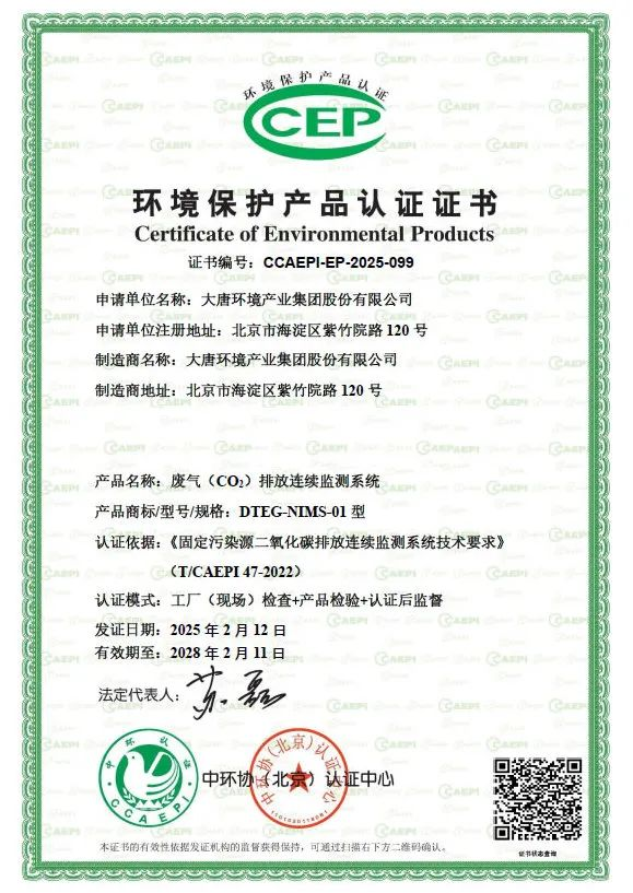 2月12日,大唐環(huán)境自主研發(fā)的二氧化碳排放連續(xù)監(jiān)測系統(tǒng)成功獲得中國環(huán)境保護產(chǎn)品認證(CCEP)證書,成為集團公司內(nèi)首家通過該認證的企業(yè)。這一里程碑式的成就不僅彰顯了大唐環(huán)境在環(huán)保技術領域的領先地位,更為國家“雙碳”戰(zhàn)略的實施注入了強勁動力。