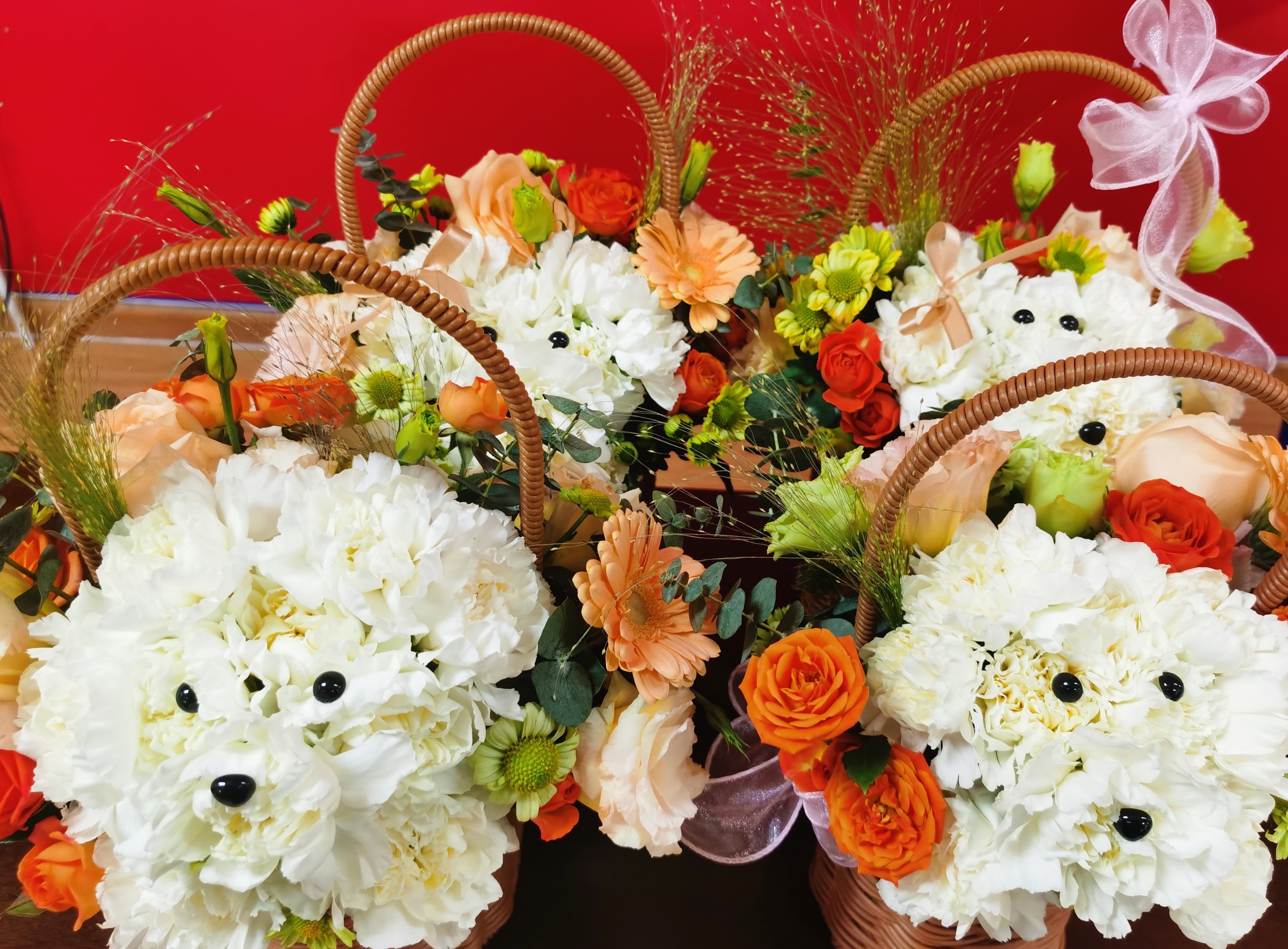 花藝?yán)蠋熛仁呛唵谓榻B了插花藝術(shù)的起源、發(fā)展、工藝等方面知識,隨后向大家介紹了此次藝術(shù)插花所使用到的花的種類。實踐環(huán)節(jié),在花藝?yán)蠋煹闹笇?dǎo)下,女職工手中白色浪漫的康乃馨逐漸呈現(xiàn)出萌萌的眼睛,嘟嘟的小嘴,在一雙雙巧手下,一個個可愛的小狗造型呼之欲出。大家發(fā)揮想象力和創(chuàng)造力,在主花的周圍整合造型,原本簡簡單單的花草在女職工們的手中變成美麗的花籃。大家看著自己親手制作的插花作品,感到滿滿的幸福和成就感。