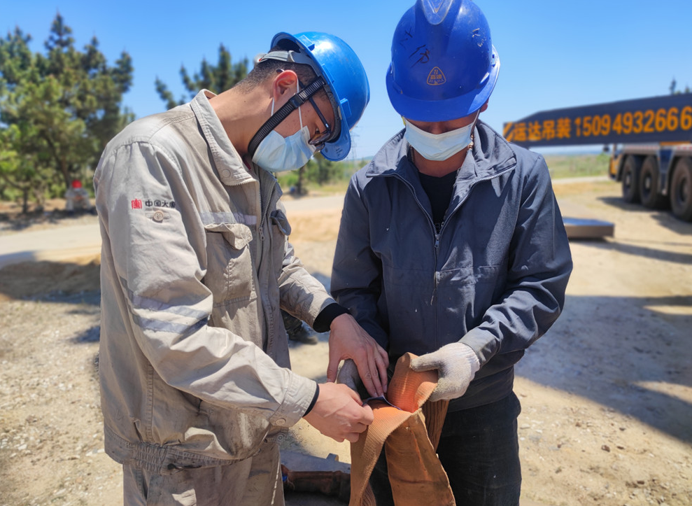萊州一期技改現(xiàn)場,監(jiān)察人員在吊裝前對吊帶進行安全檢查(劉思洋/攝)